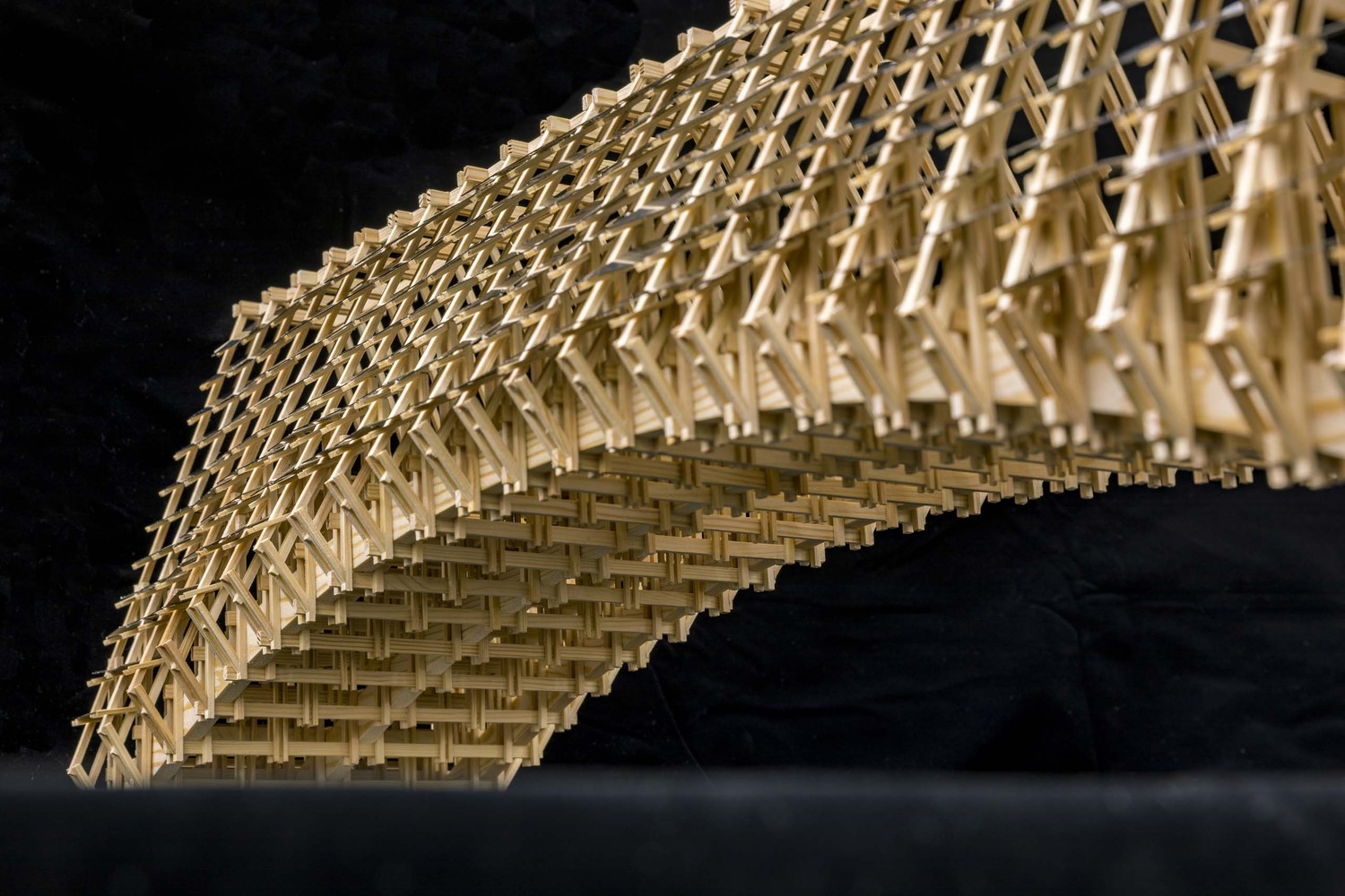 Apart from the three large wooden arched beams that bear the main load of the bridge body having a section size of 600mm*300mm, other wooden components adopt small sections. They are either 100mm*100mm or 100mm*50mm. Small wooden components are interlocked and anchored to the three main arched beams, functioning as sub-beams on upper and lower levels. In addition, the two ends of these sub-beams are combined with upward components to form a stable triangle of forces.