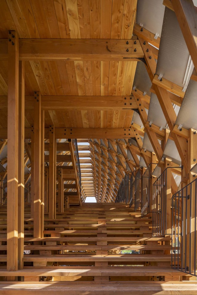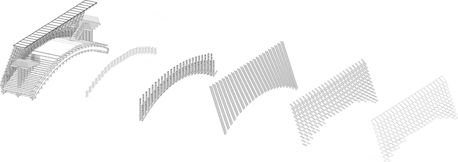 The small-scale wooden components are arranged with small spacing in between. The spacing between neighboring substructures is set at 1,000mm equally. This perfectly matches the scales of the steps and metal exteriors. Between neighboring sub-beams, three steps are set at the steep sections of the arch, while two steps are set at the gentle sections. The length of each external metal plate is controlled at about 900mm, which is appropriate for manufacturing, transporting, and installation. The 900mm length of timber frames also provides a suitable space for a single person to stand, lean, and rest.